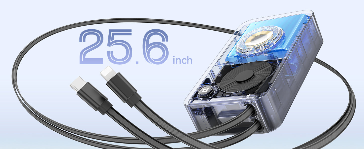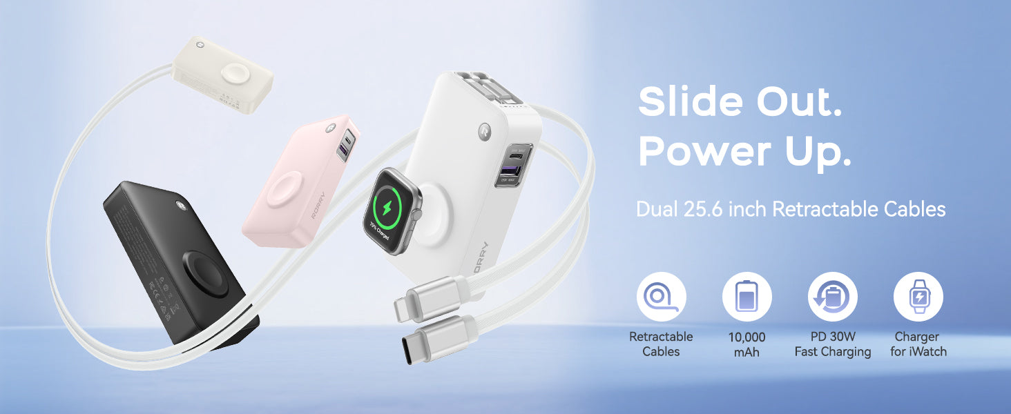 - Built-in Retractable Cables: built-in two 25.6" retractable cables, RORRY power bank offers hassle-free charging on the go. Just pull gently to extend, and the cables snap back automatically—no tangles, no mess, no clutter in your bag or pocket.