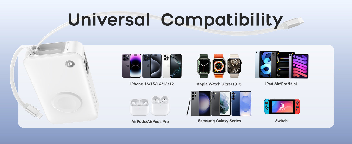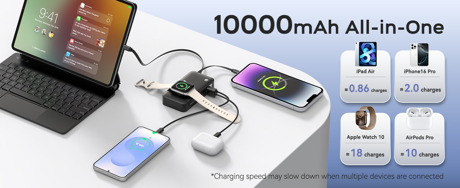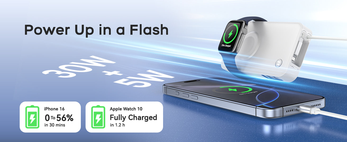 - All-in-One Power Bank for Apple Devices: Perfectly compatible with iPhone, Apple Watch, iPad, and AirPods. Charge iPhone 16 to 56% in 30 minutes, power up Apple Watch S10 in just 1.2 hours, and recharge the power bank in only 2.2 hours—one device, total convenience.