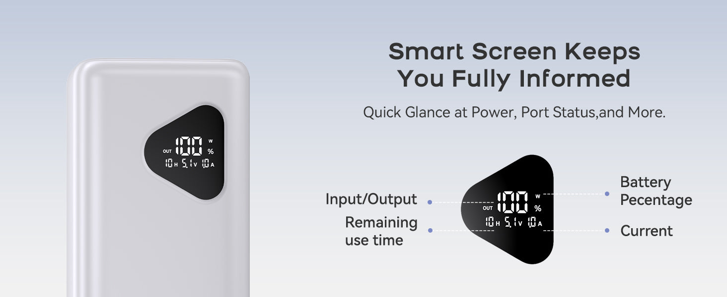 - Smart Tri Output: With USB-C built in cable, USB-C and USB-A ports, this power bank can charge three devices simultaneously while intelligently adjusting power distribution to ensure stable and safe multi-device charging. Whether you need to power a smartphone, tablet, laptop, or other electronic devices, it efficiently delivers fast charging without compromising performance.