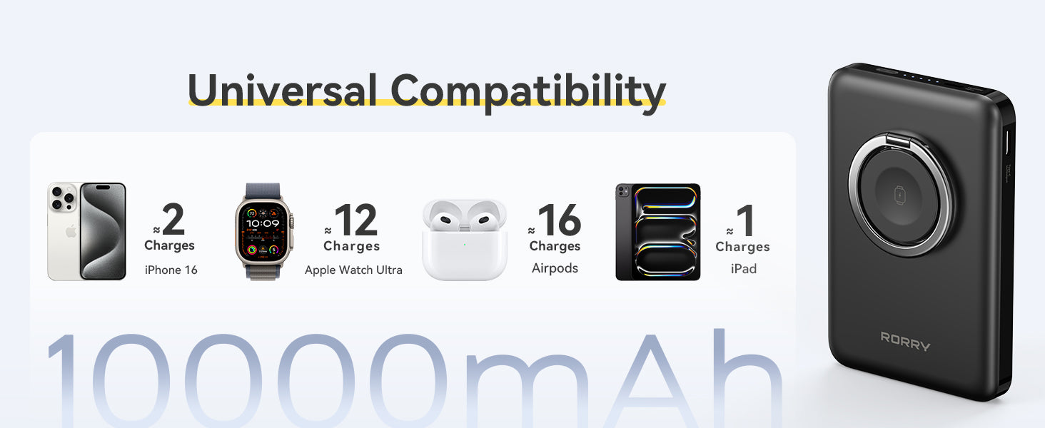 - 10,000mAh Fast Charging: Delivers 2 full charges for iPhone 16, 21 charges for Apple Watch 10, and 1.2 for iPad. iPhone 16 charges to 56% in 30 mins (wired) and fully in 2.5 hrs (wireless). Apple Watch S10 charges to 100% in 2 hrs 10 mins. Power bank recharges in 3.2 hrs!
