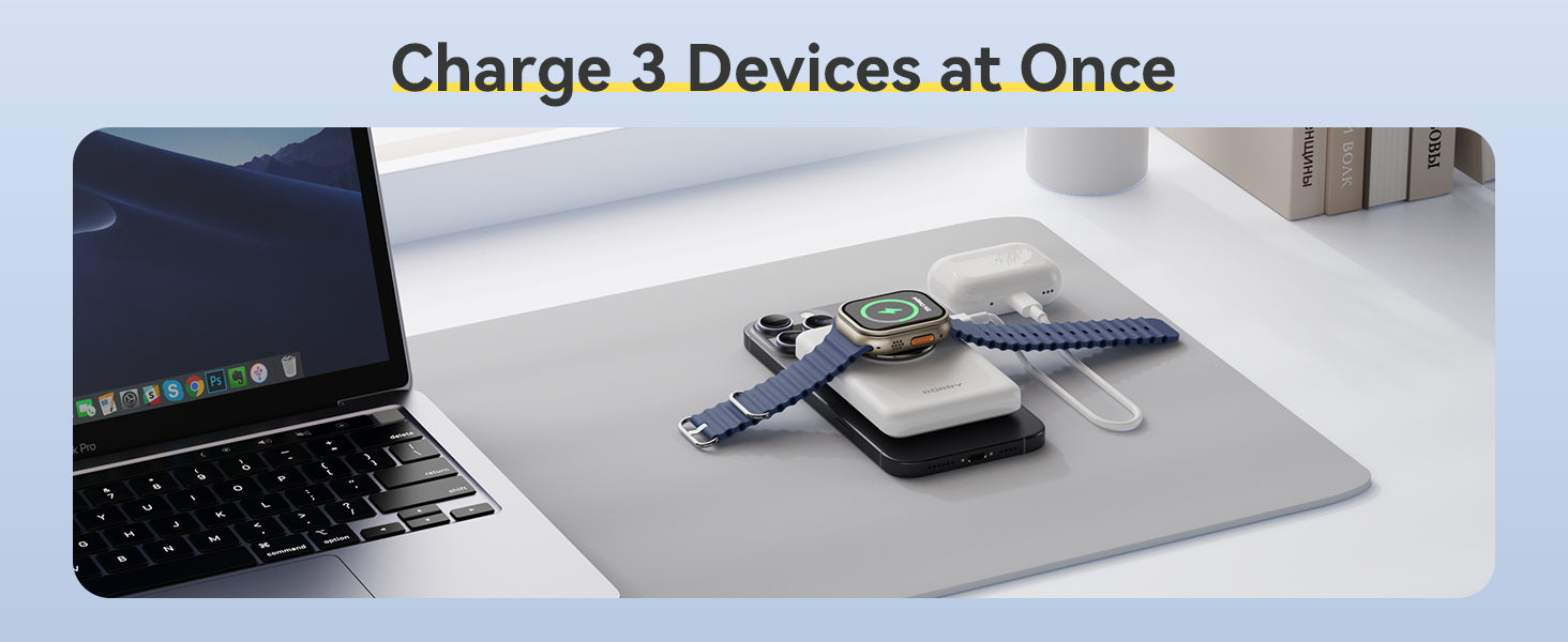 - 10,000mAh Fast Charging: Delivers 2 full charges for iPhone 16, 21 charges for Apple Watch 10, and 1.2 for iPad. iPhone 16 charges to 56% in 30 mins (wired) and fully in 2.5 hrs (wireless). Apple Watch S10 charges to 100% in 2 hrs 10 mins. Power bank recharges in 3.2 hrs!
