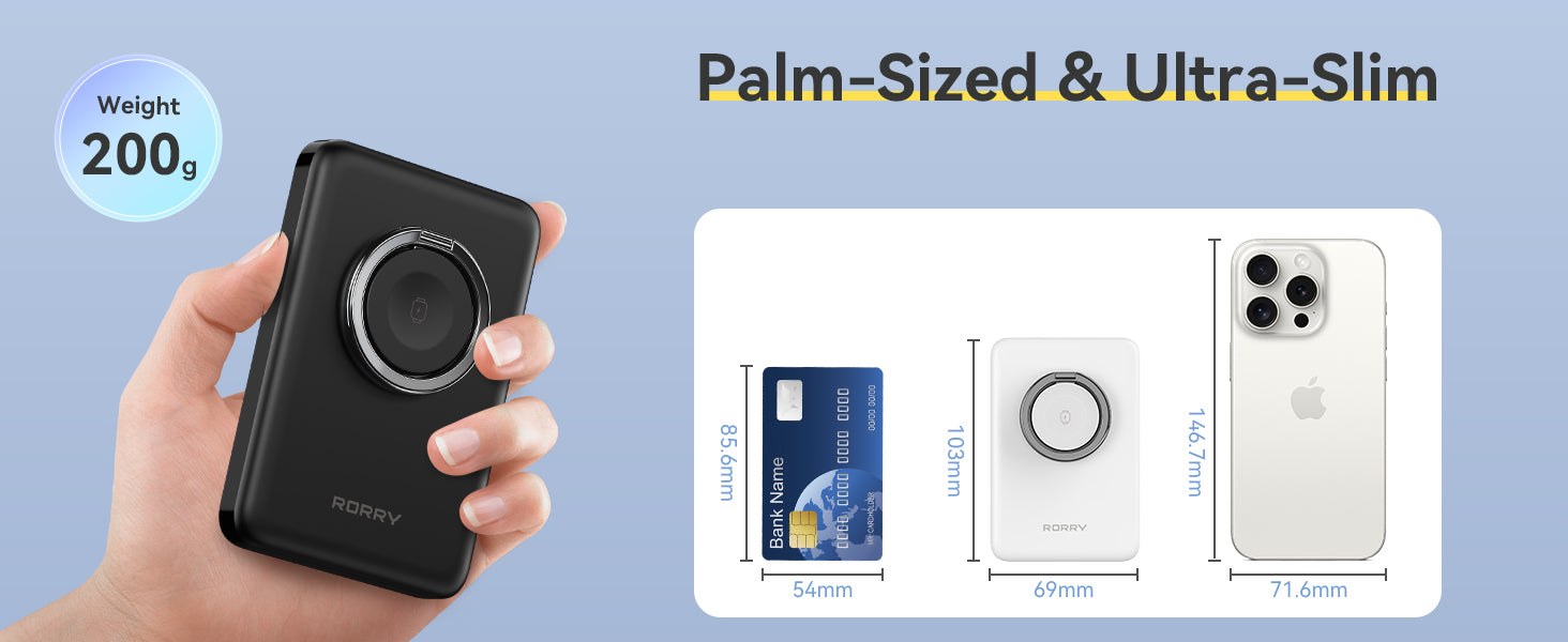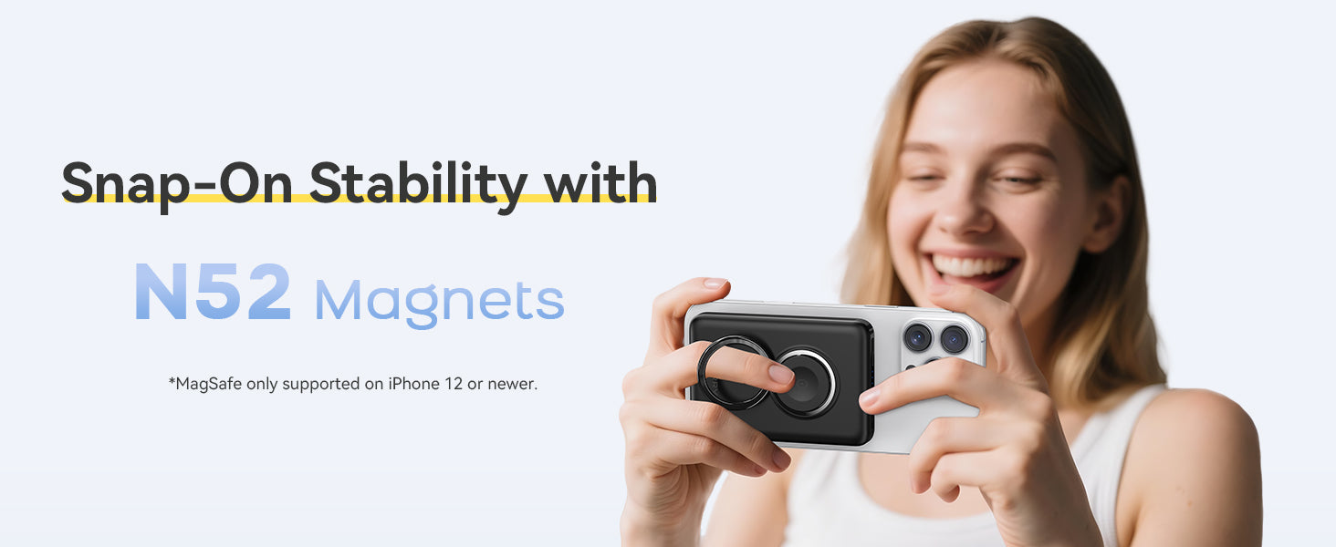 - Powerful Magnetic Lock + Ring Stand: Equipped with a 1000g magnetic force, this wireless battery pack locks your iPhone securely in place—no slips, no shakes. A built-in 360° rotatable phone ring on the back gives you a secure grip and flips out into a stand for easy viewing anywhere.