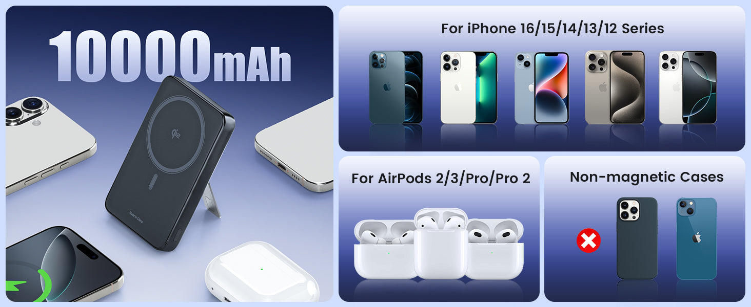- Bigger Capacity, Endless Power: With a hefty 10,000mAh battery,this for magsafe battery pack offers enough power to charge your iPhone 16 Pro up to 1.83 times and iPhone 13 Mini up to 3 times. With the 22.5W USB-C dual-direction port, you can charge two devices at once—no need to choose between your phone and another device!