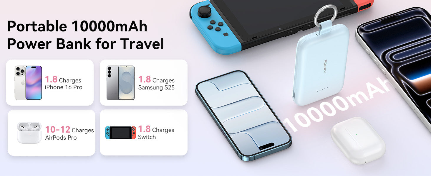 • PD 30W Fast Charging Power Bank – RORRY portable charger power bank charge for iPhone 16 Pro to a whopping 56% in just 30 minutes and fully power it up in 1.7 hours! fully charged for AirPods Pro in 1.2 hours. Enjoy a high-speed charging experience on the go!
