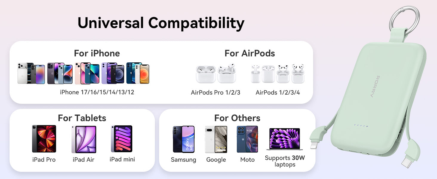 • Designed for iPhone Users – This portable charger power bank is specially designed for iPhone 17/16/15/14/13/12/11/Air/Pro/Pro Max, for AirPods 2/3/4/Pro and more. Perfect for Apple fans who want a small portable charger that works seamlessly with their devices while on the go.